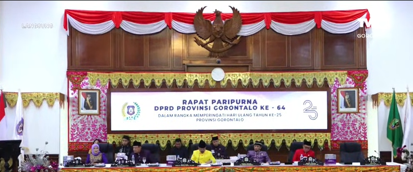 Rapat Paripurna ke-64 DPRD Provinsi Gorontalo yang dipimpin oleh Ketua DPRD, Idrus M. Thomas Mopili, turut dihadiri Gubernur Gorontalo Gusnar Ismail, Wakil Gubernur Idah Syahidah Rusli Habibie, Forkopimda Provinsi Gorontalo, serta seluruh ketua DPRD dan bupati se-Provinsi Gorontalo.